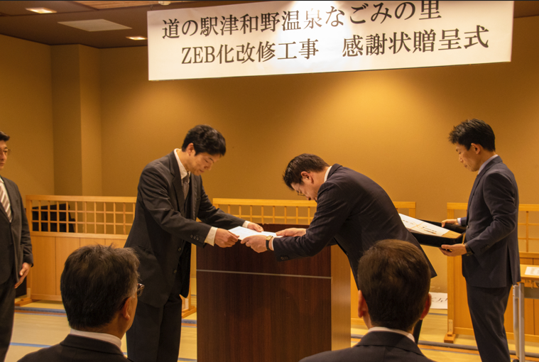 このたび、当社がZEBビルダーグループの一員として推進してまいりました「津和野町道の駅津和野温泉なごみの里ZEB化改修工事」が地域への貢献として評価され、津和野町長より感謝状をいただきました。